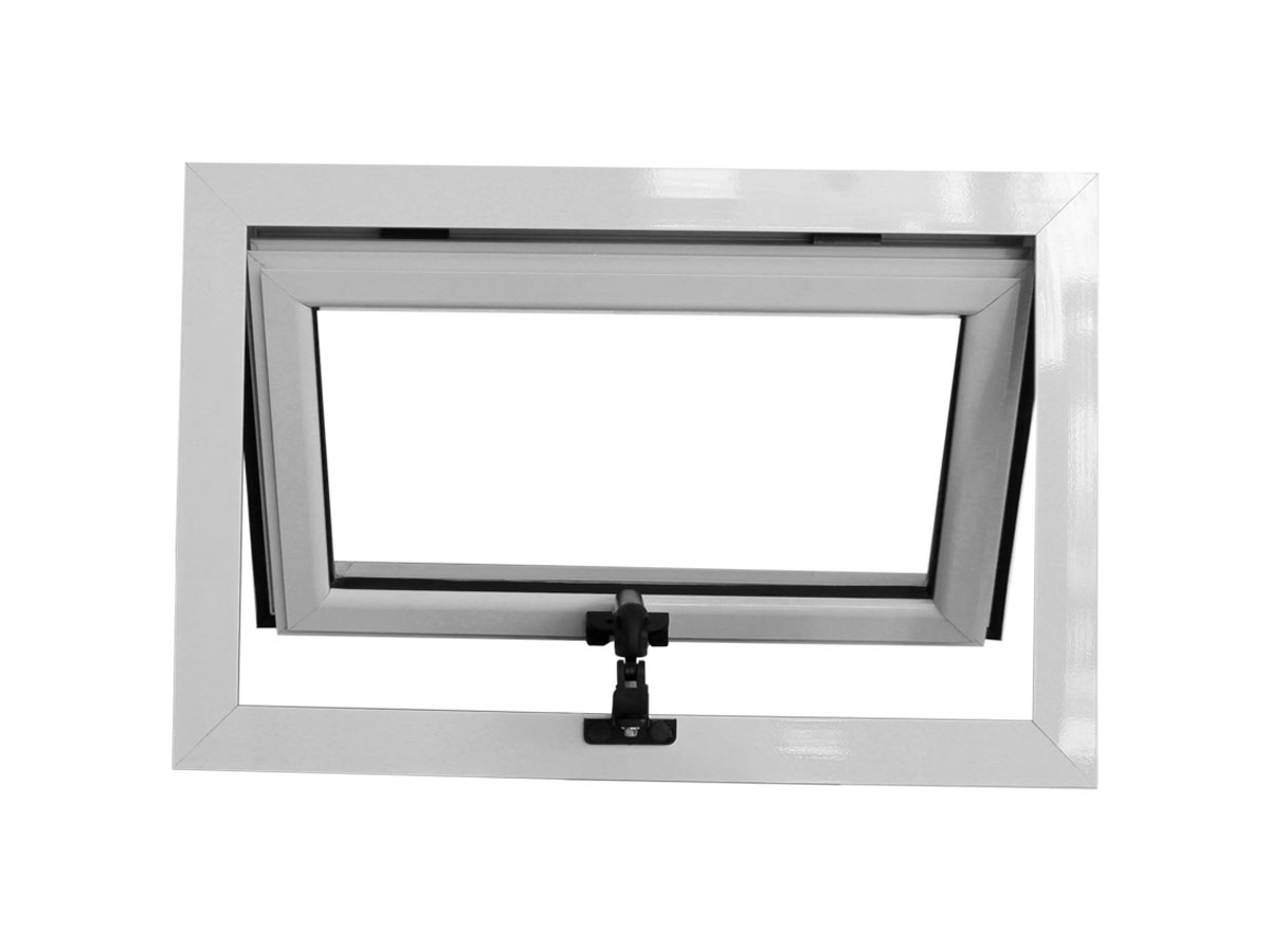 Ventiluz proyectante con bisagras de apertura hacia afuera y brazo limitador de apertura.